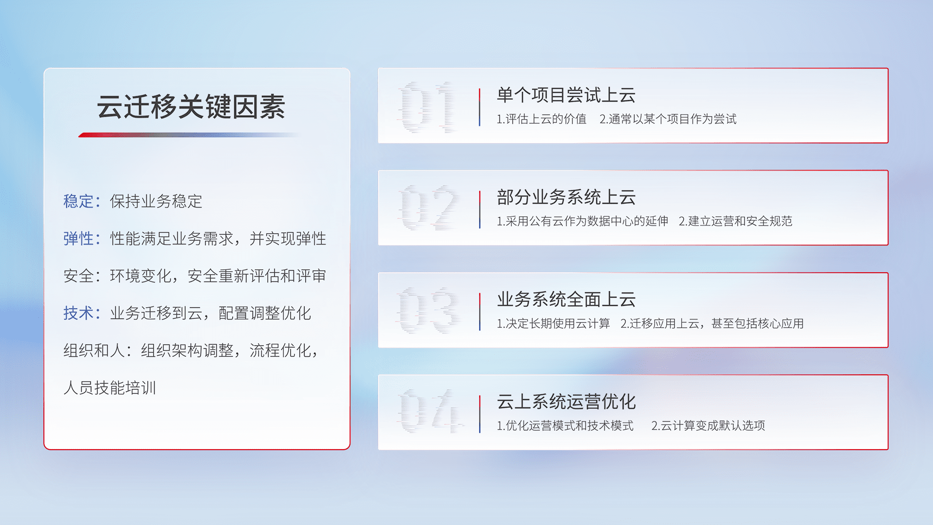 结合实际业务,,,从规划设计、、、云平台选型、、、、云原生改造、、、数据迁移、、、集成交付,,迁移全过程为客户识别最佳上云路径,,做好风险识别管理,,设计网络架构、、、身份权限、、安全审计合规、、、操作审计、、、日志审计、、监控告警策略、、多站点容灾设计等,,,,对云上基础设施进行整体规划,,提升IT治理水平,,,,以满足弹性、、、高可用、、、、高性能的需求。。